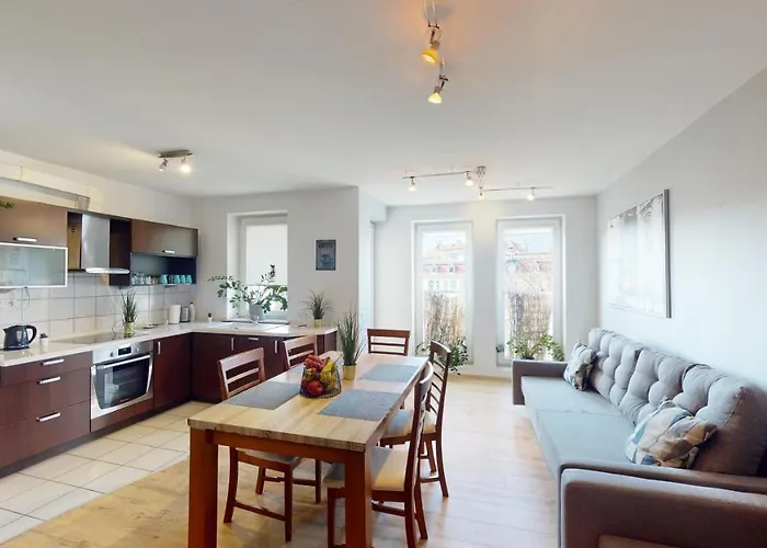 Eine Küchenzeile dieses Apartments verfügt über einen Wasserkocher, einen Kühlschrank und einen Herd. Die Gäste des Apartments können den Komfort von Ausstattung zur Kaffee- & Teezubereitung genießen. Verschiedene Speisemöglichkeiten, darunter Kot Cafe und Bistro Naroznik, sind ungefähr 350 Meter entfernt. Der nächstgelegene Flughafen Breslau-Nikolaus Kopernikus befindet sich 15 km von Apartment entfernt.